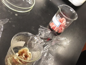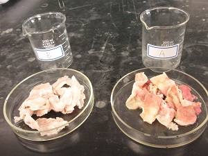 ④おいしそうに見せるために添加物が含まれていることを実験を通して学んだ生徒たち。検査や基準はクリアしていますが、食品を選ぶ際、一人一人の知識や判断が重要ですね!