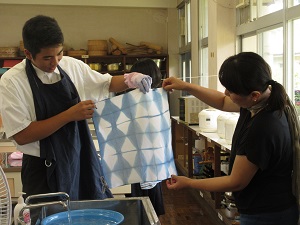 ハンカチの絞り方や折り方、染液につける時間や回数で色が変わり、時間と根気がいる作業でした。自分の理想の染め方にするにはどうしたらいいか講師の先生に質問したり、染め上がったハンカチを広げたときに、満足そうな表情を浮かべていました。