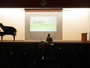2月4日(火)、2月全校朝礼が行われました。今月は、英語科の浦田先生に講話をしていただきました。浦田先生は、ご自身のセンター試験の話をしてくださいました。