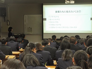 公務員や一般企業への就職、大学や看護専門学校へ進学する6名が1・2年次生全員にアドバイスを送りました。6名の生徒それぞれがパワーポイントを使い、受験を通して大変だったことや勉強方法について発表し、1・2年次生は熱心にメモを取っていました。6名が共通して、家庭学習の習慣・学力の定着が大切さについて話していました。