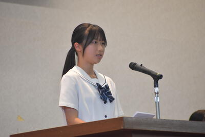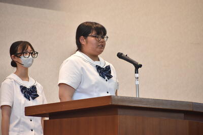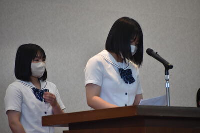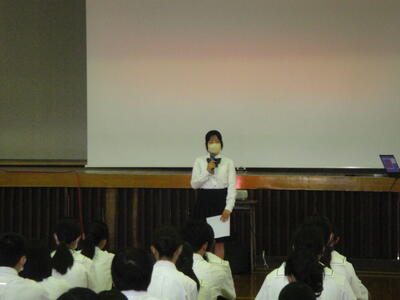 最初に生徒会副会長より挨拶・生徒会選挙についての案内がありました。挨拶の中で昨日まで開催された高校総体・総文祭に関する話題に触れ、牛高生の活躍を全校生徒で共有しました。