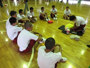 7月17日(水)、天草広域連合南消防署から4名の方にお越しいただき、1年次生を対象に救急救命訓練講習会を行いました。