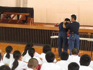 心肺蘇生法(119番通報、意識確認、胸骨圧迫、AEDの使用)、異物除去、止血法について学びました。署員の方は「いざという時に手を差し伸べることができる人になってほしい。勇気ある行動をしてほしい。」話されていました。生徒を代表し、吉浦くんが「今回の講習を覚えておき、いざという時におき、活かせるようにしたい」とお礼の言葉を述べました。