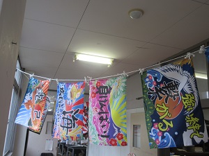 書道選択者が書いた文字が大漁旗となり、展示中です。見ていると元気になります!