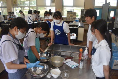 【家庭科】では「食品の色味と食欲について」の授業がありました。透明な醤油と着色料を使って、カラフルみたらし団子を作りました。