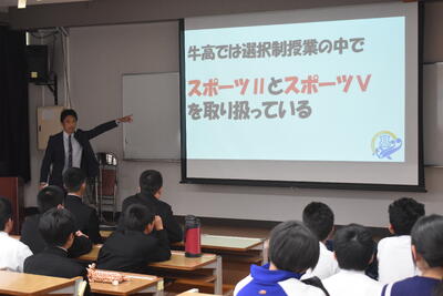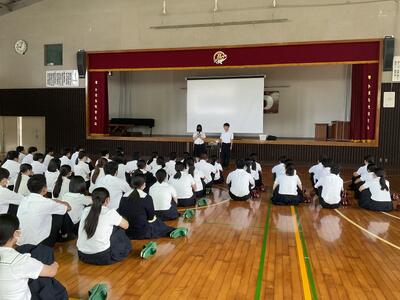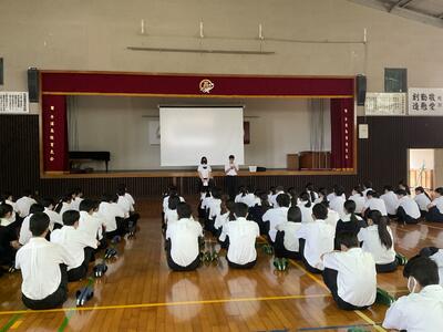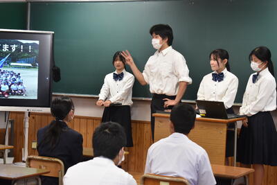 前半は生徒会執行部の生徒や協力生徒がそれぞれの出身中学の後輩たちに向けて、牛深高校についてプレゼンテーションをしました。