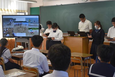 本校からは2年次尾上さん、山下さんが登壇し、今月末に控えたロゲイニングをもとにしながら作成した牛深の魅力発見動画を放映し、プレゼンしました。