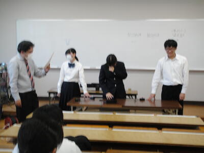 スキットとは短い寸劇のことです。与えられたテーマに沿って自分たちでオリジナルの台本を作りそれを英語で演じます。今年度は牛高の1年次生全員が英語の授業の中で取り組み、12月に校内スキットコンテストを実施しました。
