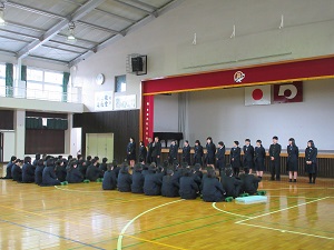 はじめに旧生徒会長より、「生徒の皆さん、生徒会のみんなに支えてもらいながら、どうしたらみんなが学校生活を楽しく過ごせるかを一生懸命考えてきた。生徒会活動を通して自分自身の成長につながった。これから新生徒会のメンバーで、より活気ある牛深高校を築いてほしい」と挨拶とお礼の言葉がありました。また、新生徒会長より、「これから新メンバーで牛深高校を活気づけていきたい」と挨拶があり、熱い思いを語ってくれました。