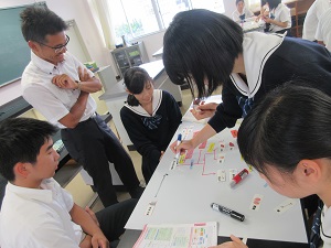 グループに分かれ自己紹介を行い、「牛高校舎すごろくゲーム」や折り紙や新聞紙でかぶと作りなど、短い時間でさまざまな活動を楽しみました。学校の紹介をしたり、けん玉やだるま落としなどがあり、生徒も盛り上がりました。最後は、校歌を歌いました。