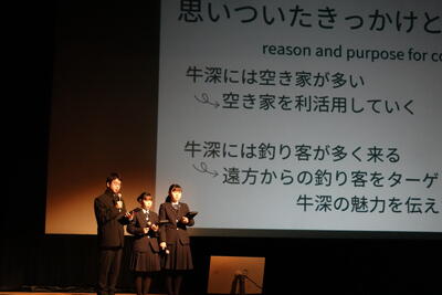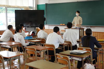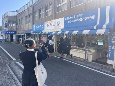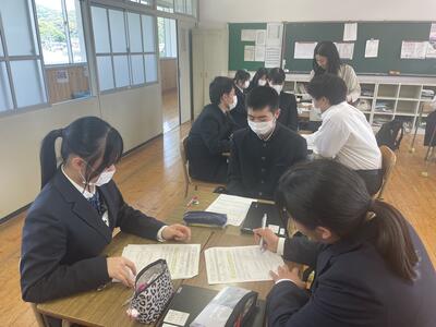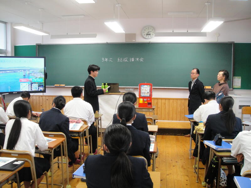 平山様からは、牛深地域の現状と課題、特徴的な事業の話を聞き、探究学習のテーマを考えるうえで参考になりました。筧様からは、先日から始まった「ご当地ガチャ」の説明があり、まちおこしを目的としたユニークな取り組みに、生徒は関心を持ったようでした。