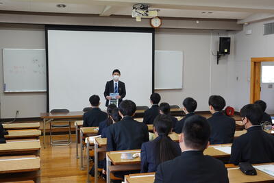 また、教育実習生の濵﨑先生から高校生の時の探究活動についてのお話をいただきました。