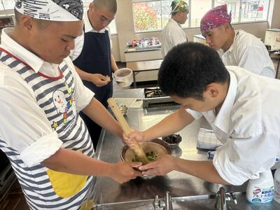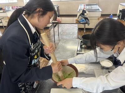 それを4月15日に刻み、すり鉢と擂粉木でペーストにしました。よもぎの香りが苦手な生徒もいましたが、初めての経験だったようで「自分で作ることができるんだ」と楽しんで作ることができました。また、よもぎの風味とあんこの相性がバッチリと美味しく食べていました。