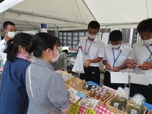 7月31日(日)の牛深みなとフェスティバル「海族祭」で販売実習を実施し、今年度は3年次の情報ビジネス系列の生徒15名が担当しました。初めての店舗運営でしたが、商品陳列や金銭授受など試行錯誤しながら販売・接客を頑張りました。また、事前に商品知識を身に付けたおかげで、しっかりとPRして販売することができました。夕方には無事に完売することができ、達成感と喜びをみんなで分かち合いました。