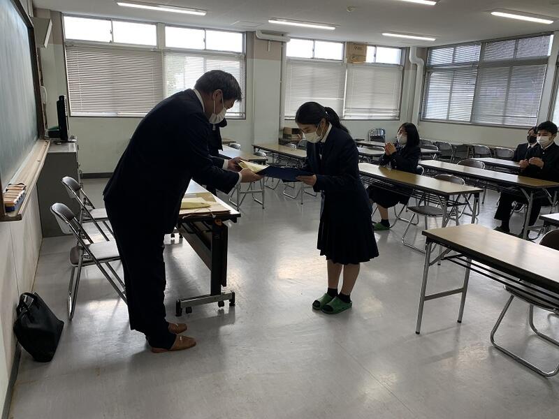 令和3年度卒業証書授与式が行われました。新型コロナウイルス感染症の影響により参加者の数を縮小した形での実施となりましたが、今年度はライブでの配信も行い、より多くの保護者の方々が見ることができるよう工夫して行われました。43名の代表として、1組加世田さん、2組さん田中さんに卒業証書が渡されました。送辞では、2年次の川下さんから3年生に対してはなむけの言葉が送られました。答辞では、3年次の村田さんが新型コロナウイルス感染症によって制限があった学校生活を前向きにとらえ努力した自身の経験や、友人への感謝などを話しました。退場の際にはクラス全体で保護者に対して感謝の言葉を述べるなど、今年の卒業式も心温まるものとなりました。最後のホームルームでは、担任から1人1人に卒業証書が手渡され、生徒たちは友人や保護者、教師などに対して最後のスピーチを行い学校を巣立っていきました。