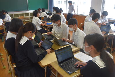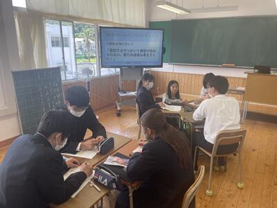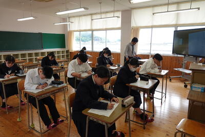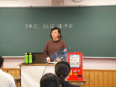 平山様からは、牛深地域の現状と課題、特徴的な事業の話を聞き、探究学習のテーマを考えるうえで参考になりました。筧様からは、先日から始まった「ご当地ガチャ」の説明があり、まちおこしを目的としたユニークな取り組みに、生徒は関心を持ったようでした。