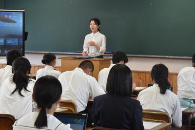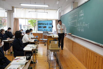 また、教育実習生の濵﨑先生から高校生の時の探究活動についてのお話をいただきました。