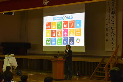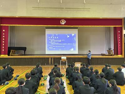 12月12日(木)、本校体育館にて、大阪・関西万博への出展企業・団体による特別出前授業を開催しました。講師として、放送作家/大阪・関西万博テーマ事業プロデューサーである小山薫堂氏をお迎えし、「『いのちの輝き』ってなんだろう?」をテーマに講演いただきました。牛深東小学校、牛深中学校、牛深東中学校の皆さんも参加し、会場は多くの笑顔と感動に包まれました。