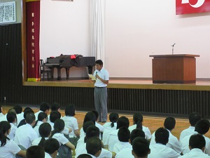「事務という職業柄、生徒と直接関わる機会は少ないが、体育大会などの行事を通して感動を生徒と共有できることが学校という職場の魅力だと思う」と話されました。また、『高校生活、仕事に就いてからも、あの時こうしておけばよかった』と思うこともあるが、そのときの経験・判断・努力が今の自分につながっているので、「今すべきことを一生懸命頑張ることが将来の財産になる、3年間で自分を磨きましょう!」と生徒にエールを送られました。