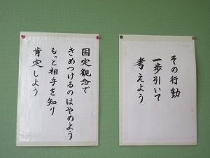 本校では、先日の全校朝礼で、生徒会長から差別やいじめを許さない学校づくりについて話がありました。また、廊下には、書道部のみなさんによる人権メッセージが掲示されています。人権メッセージを見て、普段の自分自身について見つめなおすいい機会にもなると思います。