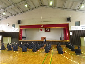 中島校長が「本校は、平成27年に開校したばかりの若い学校。本校で学ぶみなさんに高校3年間で高校生としての自覚と実践してほしいことが3つある。『高校は学問をするところ』、『強く逞しい心と身体をつくること』、『集団生活の中で、連帯と友情の輪を広げていくこと』。これら3つのことを心に留め、自分の目標に向かい努力を続けてほしい。」と式辞を述べました。