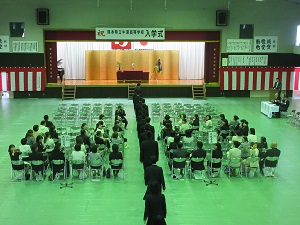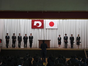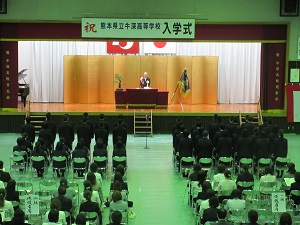 その後牛高スピリッツ「明るいあいさつ・意欲的な活動・けじめのある生活」の説明の後、全校生徒で復唱し、校歌を歌いました。1年次生も集団宿泊研修で習った校歌を堂々と歌い、牛深高校生の一員としてスタートを切りました。