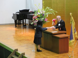 続いて新入生を代表し、唐田さんが「高校入学の1歩は、期待と希望に満ちていると同時に不安と緊張もあるが、自分の考えで切り開いた道である。これまで以上に自分の選んだことに大きな責任が伴う。自分の目標に向かって科目選択を行い、精一杯努力したい。また、部活動、生徒会にも積極的に取り組み、新たな経験を通して多くのことを学びたい。新たな仲間とともに助け合い高め合いながら、頑張っていきます。」と新入生代表宣誓を述べました。