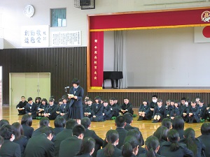 平田校長より「3期生として入学した51名を迎え、新生牛深高校として3学年がそろい、今年は、本校が基礎を固め、飛躍する年であり、みなさんには大きな期待を寄せている。本校発展のために、ともに最善を尽くしていきましょう。また、『敬愛・勤勉・創造』の3校訓のもと、自分の良さを見つけ、自分を磨き、目標を高く掲げ挑戦し、自分の未来を切り拓いてほしい。」と式辞がありました。