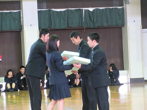 代表生徒からクラスに記念品が贈呈されたあと、生徒会執行部の紹介、主将・キャプテンによる部活動紹介が行われました。委員会活動や部活動にも積極的に取り組んでほしいと思います。