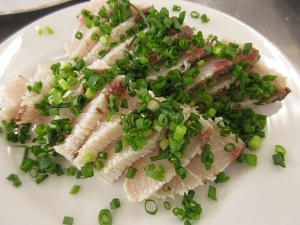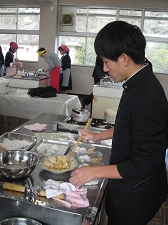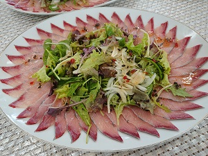 調理では、5班に分かれて2人で1匹の鯛をさばきました。3枚に下ろし腹骨の部分を取り除いたあと、刺身用に皮を引きました。皮を引く作業が難しかったようですが、各班、講師の先生に包丁の使い方などアドバイスをいただきながら、鯛の刺身を作ることができました。他にも、ブリのたたき、ブリのマヨネーズ焼き、潮汁、にぎり寿司、カルパッチョ、ブリのあら煮が完成し、魚料理をおいしくいただきました。卒業前に自分が生まれ育った天草の食文化を知ることができ、貴重な経験となりました。