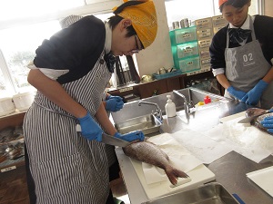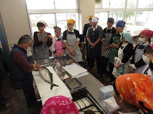 はじめに養殖業についてお話を伺いました。「養殖の魚は、産地や品質も保証され人気となっている。魚離れが進む中で、まずは地元の人に魚のおいしさを知ってほしい。今日は、失敗を恐れずに魚さばきをやってみましょう。」とあいさつがありました。その後、ブリと鯛の魚さばきのデモンストレーションを見学しました。あっという間に魚をさばく職人技に圧倒されていました。