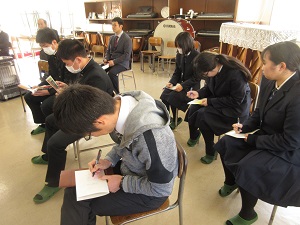 16日(木)には、激励会が行われました。中島校長から「受験会場の周囲の人と比べることなく、答案用紙としっかり対話をしてほしい。何より元気に受験会場へ行ってほしい。」と励ましの言葉をいただきました。受験生を代表し、吉浦くんが「これまで支えてくださった家族や先生方に感謝したい。仲間とともに精一杯頑張りたい。」と力強く決意の言葉を述べました。