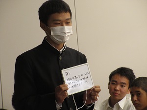 アイスブレイクのあと、グループに分かれて『防災クロスロード』に取り組みました。YES・NOどちらが正解と決まっていない問いに対して、グループで一つの答えを出しました。班員の答えを尊重し合いながら、議論を交わしました。災害時(緊急時)も周囲の意見に流されず冷静な判断をすること、そして少数の意見を傾聴する姿勢を学びました。今後、災害時(緊急時)の対応に活かしていきます。