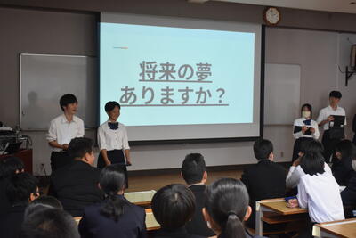 前半は生徒会執行部の生徒や協力生徒がそれぞれの出身中学の後輩たちに向けて、牛深高校についてプレゼンテーションをしました。