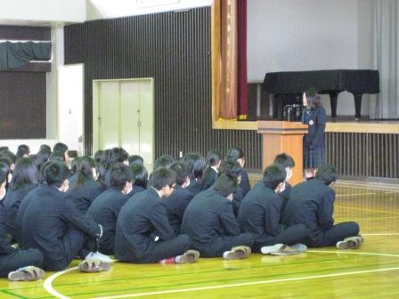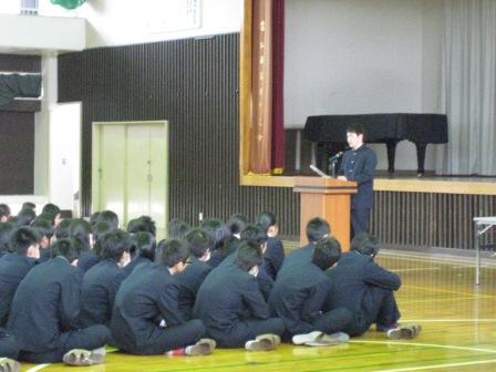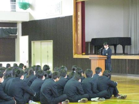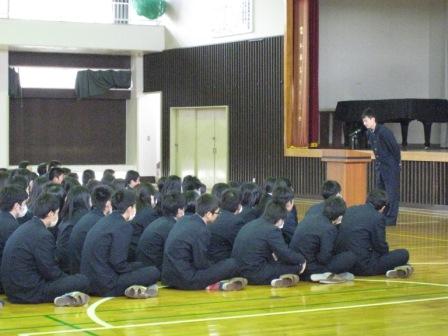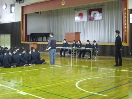2月27日(金)6限目に「受験体験報告会」が行われました。進路が決定した3年生(就職2名、進学3名)が、自分の進路を決めるきっかけや受験へ向けての取り組みを後輩たちへ伝えました。「進路希望を早く決めると準備に時間がかけられる。」「オン・オフの切り替えが大切。」など、在校生には進路実現に向けて参考としてほしい話でした。