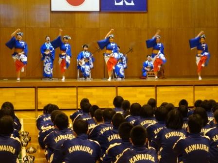 2月4日(水)に、郷土芸能部が河浦中学校で牛深ハイヤを披露しました。ほとんどの生徒が初めての牛深ハイヤ。皆さん、真剣なまなざしで見てくださり、部員たちもそのまなざしに答えるべく、満面の笑顔で踊りました。代表生徒からは伝統を伝えていくことの大切さについて触れた、お礼の言葉をいただきました。河浦中学校の皆さん、ありがとうございました。