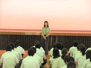 9月3日(火)、9月の全校朝礼が行われました。今月は、養護教諭の榎田先生からの講話と文化委員会から文化祭テーマの発表がありました。