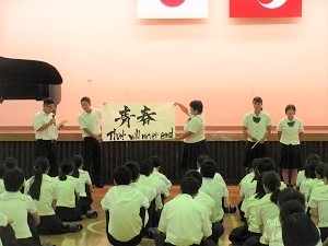 文化委員会からは、10月26日(土)に行われる文化祭テーマの発表がありました。今年度の文化祭テーマは「青春~That will never end~」となりました。青春は永遠に終わらないという意味です。私たちの青春を保護者のみなさんや観客のみなさんに見ていただき牛深高校生の元気やパワーを感じていただきたいです。