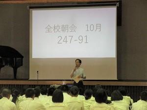 10月31日(木)、11月全校朝礼が行われました。今月は、数学の内村先生に講話をしていただきました。内村先生は、「考えること」についてお話されました。