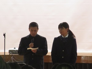 新生徒執行部の紹介があり、中村君が「牛深高校生が多くの人に応援され、校内外で活躍できるよう取り組んでいきたい」とあいさつしました。