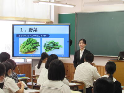 授業の冒頭では食品を選ぶ基準について学びました。野菜に魚、肉などの鮮度を見分ける基準について、生徒の意見をうまく引き出されていました。