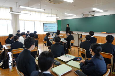 平山様からは、牛深地域の現状と課題、特徴的な事業の話を聞き、探究学習のテーマを考えるうえで参考になりました。筧様からは、先日から始まった「ご当地ガチャ」の説明があり、まちおこしを目的としたユニークな取り組みに、生徒は関心を持ったようでした。