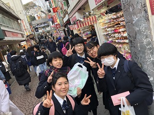 原宿の竹下通りに行ったときは、自分たちと同じくらいの年代の人がたくさんいる中に、ガタイのいい外国の人が客引きをしていました。自分たちは「アニキ~」や「ナイスボーイ!」などと呼ばれました。班員の中には、外国人と間違われて英語で話しかけられた人もいて、とても面白かったです。