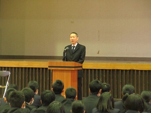 生徒会長・五十嵐さんが「授業だけでなく、休み時間や行事などを通して、先生とたくさんお話ができるようになりたい」と歓迎のあいさつを述べました。