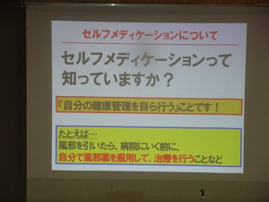 次に橋本管理栄養士から「セルフメディケーション」と「登録販売者」についてお話がありました。「自分の健康管理を自ら行うセルフメディケーションの第一歩は、朝食をきちんと摂り、身体と脳のスイッチを入れることが大切。そして、セルフメディケーションを支える専門家として『登録販売者』の資格があり、高校生でも取得が可能である。」ということも教えていただきました。