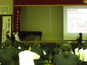 最後に生徒を代表し、保健委員長・武井さんが「薬物は本当に怖いものだと改めて感じた。『1回だけ』『少しだけ』という軽い気持ちではなく、自分の行動が正しいかしっかりと考えて行動するようにしたい。また食事をきちんと摂り、健康に過ごせるようにしていきたい。」とお礼の言葉を述べました。
