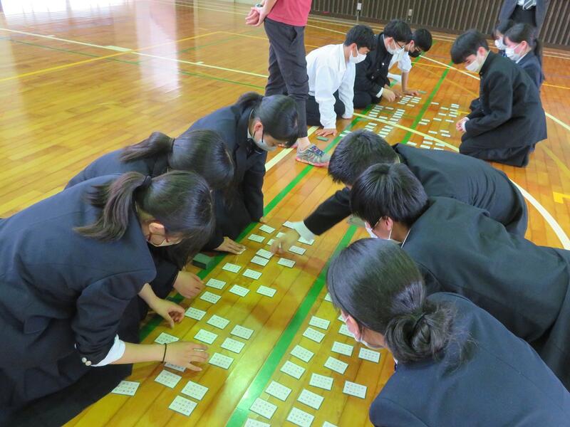 4年ぶりに校内百人一首大会が行われました。試合はチーム対抗で行われ、1回戦は源平戦形式、2回戦はちらし形式で対戦しました。それぞれの得意札が読まれた時などはとても盛り上がり、各所で白熱した戦いが繰り広げられました。日本の伝統ある文化に親しむことができ、楽しい時間を過ごすことができました。