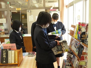 貸出や返却の方法、読みたい本のリクエスト受付などについての説明を行いました。その後、自分の好きな本を選んで借りました。これまで図書館をあまり利用していなかった人も、高校3年間でたくさん図書館を利用してください。