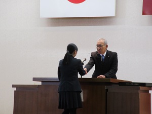 交通委員長・上田朱さん(2)は、「イヤホンの使用により音が聞きとりにくくなることを実感した。冬休みは、交通量が増えるためこれまで以上に交通安全意識を高く持ち、命を大事にしたい」とお礼の言葉を述べました。