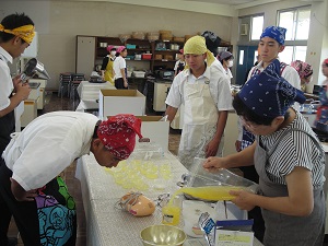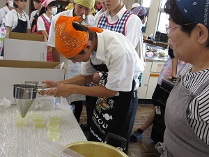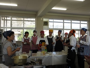 講師に松本香代子様をお迎えし、地元の特産物である晩柑を使った晩柑シフォンケーキと晩柑ゼリーを教えていただきました。また、起業まで何度も失敗や困難があったが、そこで諦めず挑戦し続けたという話をうかがうことができました。安心安全な食品の開発や「食」と「農」についてのお話を通して、「目の前のチャンスを掴んでほしい」と話されていました。